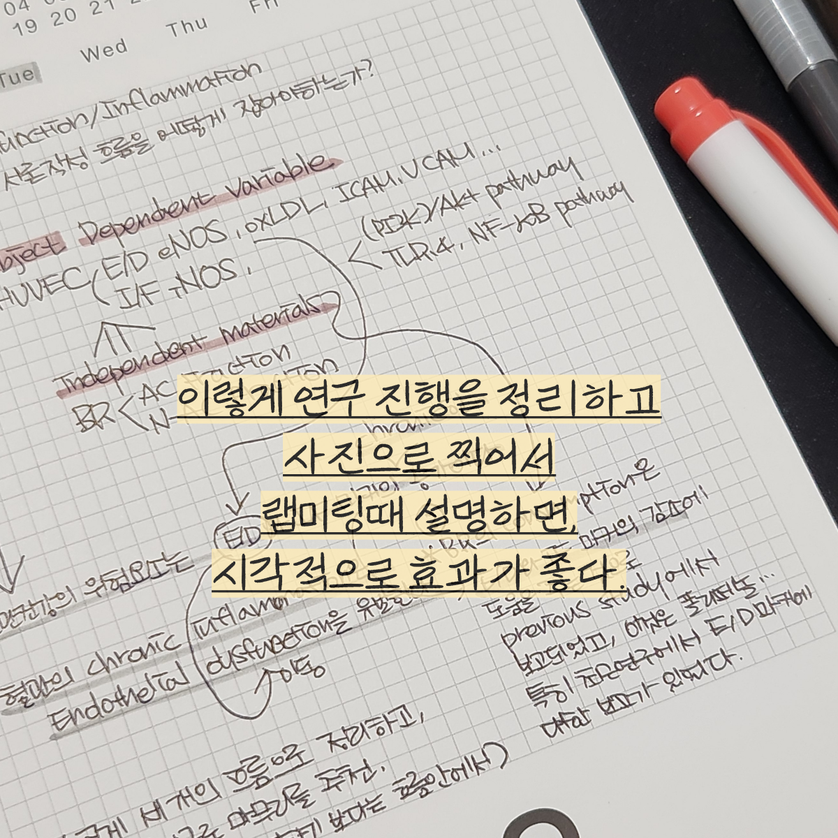 그리고 최근에는 연구원들이나 클라이언트와 미팅을 할 때, 내가 연구노트에 정리한 내용을 사진으로 찍어서 띄워놓고 설명을 하거나 이메일로 보내고 코멘트를 한다.