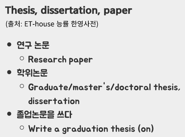 논문을 영어사전에서 찾아보면, dissertation, thesis, and paper라고 번역된다.