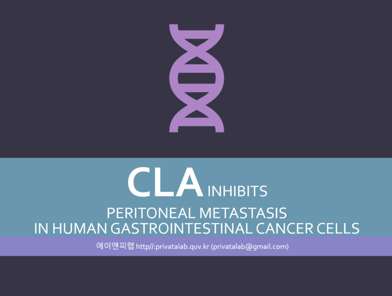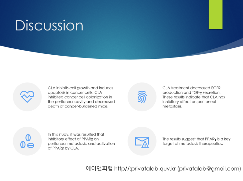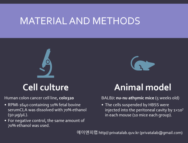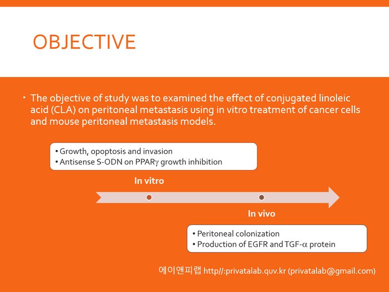연구목적은 대부분 영문논문 초록의 맨 처음 또는 두번째 문장이나 서론의 맨 마지막 문단, 고찰의 맨 앞 문단에 있으니 가져와서 만든다. 아래의 슬라이드처럼 목적을 달성하기 위한 세부 연구목표(아래의 연구는 한때 다이어트 소재로 유명했던 CLA가 항암효과가 있는지 세포모델과 동물모델을 이용해서 본 연구이다)를 추가해서 그림나 개조식으로 표현하면 더 좋다.