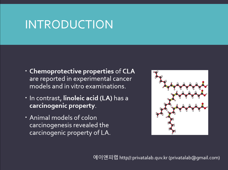 시간이 촉박하다면, 이 때에는 정독을 하기보다는 서론의 도입부에서 연구대상의 특성과 연구문제에 대한 부분을 찾아내어 슬라이드로 만든다. 아래의 슬라이드는 다이어트 소재로 알려진 CLA에 대하여 소개하고 있고, 이 물질이 항암효과도 있을 것이라고 연구대상물질을 소개하고 있다.