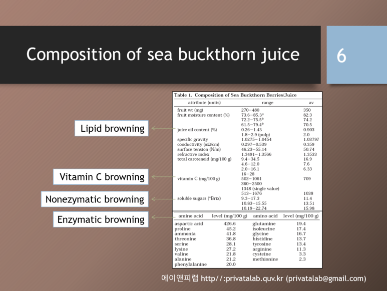 아래의 그림처럼 중요한 결과는 화살표로 표시해서 강조하면 좋다. 지금 아래의 연구자는 발표에서 비타민나무 쥬스가 함유하고 있는 성분분석 결과를 보고, 갈변을 일으킬 수 있는 화학반응들을 유추해내고 있다. 정말 논문을 해석한다느 것은 결과 수치가 아니라, 그 안에 내표되어 있는 의미들을 찾는 것이 매우 중요한 것이 사실이다. 이 발표를 한 연구자도 PPT에 결과표를 붙여놓고, 계속 논문의 고찰과 서론을 다시 읽고, 화학반응들을 유추해 내었을 것이다.