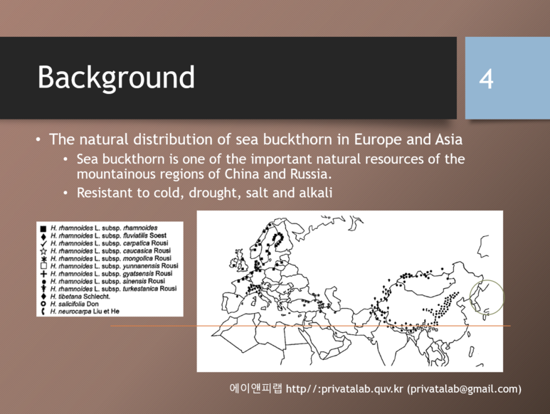 아래의 슬라이드는 연구배경에서 연구소재인 비타민 나무의 원산지와 재배지역에 대하여 소개하면서 이 물질의 특성을 설명하고 있다.