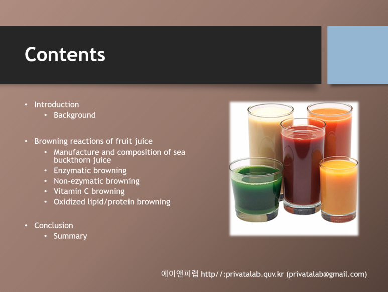 보통 서론(연구배경/연구목적)-연구방법(연구설계/연구대상/통계방법)-결과(결과표/그래프)-결론(고찰/결론)의 순서로 만들면 된다. 그리고 아래의 그림에 있는 목차처럼 어떠한 주제(비타민 쥬스의 갈변현상)에 대하여 여러 논문을 발췌하여 발표할 경우에는 소제목을 넣어주면 좋다.