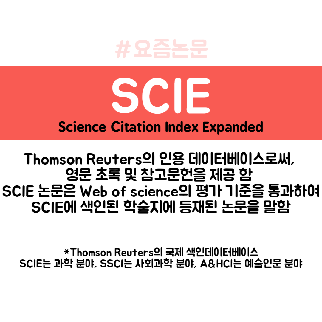 이 중에서도 SCIE는 과학 분야, SSCI는 사회과학 분야, A&HCI는 예술인문 분야의 색인 학술지데이터베이스이다.