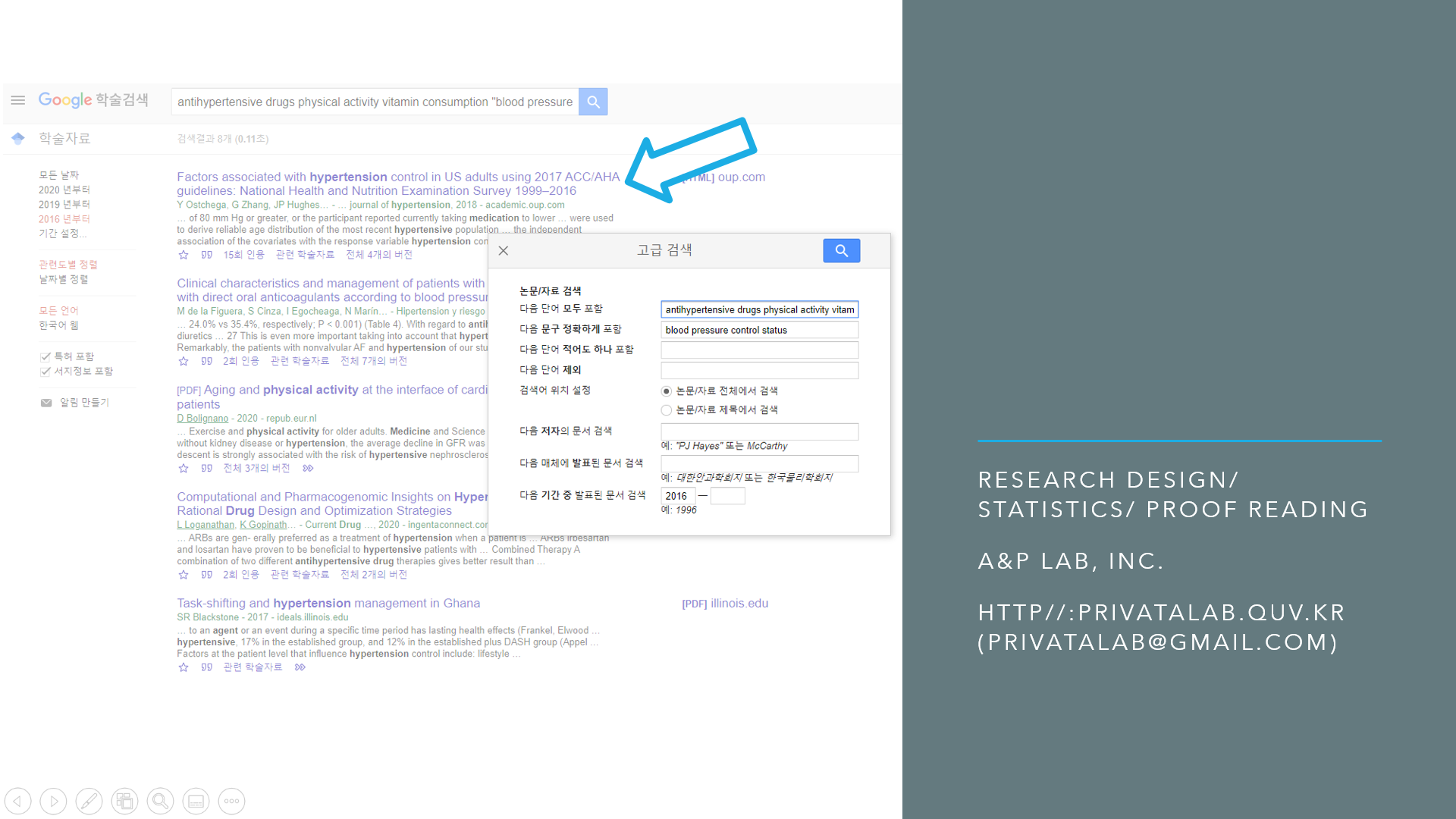 국민건강영양조사자료를 이용하여 고혈압 치료제를 복용하는 환자의 혈압 조절률에서 각각의 단어를 적합한 영문키워드로 만들고, 내 연구 결과에서 혈압조절에 유의적인 영향을 주는 요인이 신체활동과 비타민섭취였으므로 이를 위주로 키워드를 추가하여 키워드 리스트를 만든다.