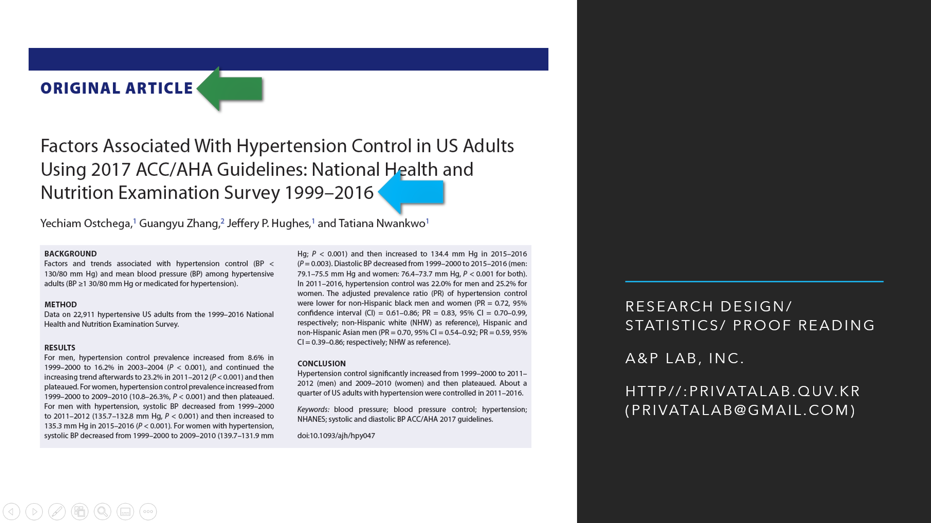 검색된 유효논문은 8개 뿐이며, 맨 위의 논문이 미국 NHANES자료를 이용하여 고혈압 조절에 대해 분석한 조사연구로써 2018년도에 'Journal of Hypertension"에 개제된 논문이다. 이런 좋은 논문들은 원문도 open access로 바로 열려서 매우 좋다!(이것은 완전 중요한 저널의 특급 참고논문이고, 이 논문을 인용하지 않으면, 리뷰어들이 이 논문도 안봤냐고 심사할 것이 분명하다.)