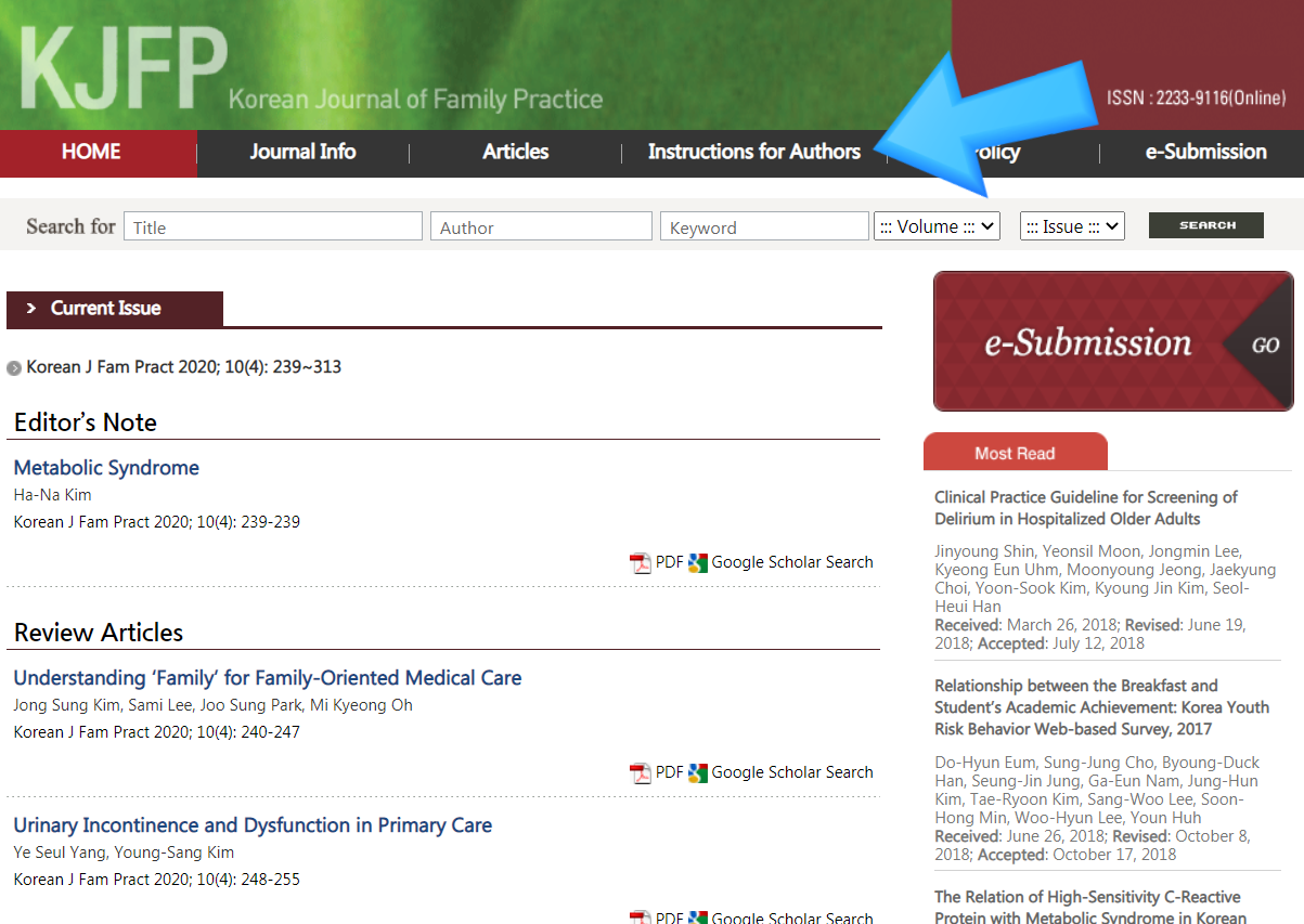 예를 들어, 가정의학회지를 살펴보면, 아래 화살표가 있는 instruction for author로 들어간다.