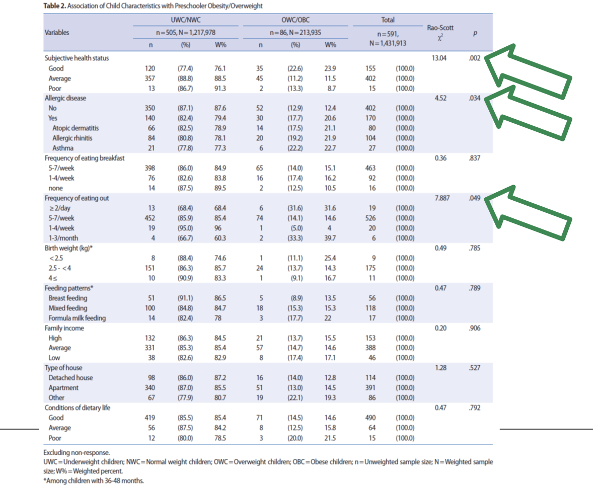 초록색 화살표에 표시된 라오-스콧(Rao-Scott) 카이제곱 검정 결과, 아동의 주관적 건강상태(p =.002), 알레르기성 질환(아토피피부염, 알레르기비염, 천식 중 하나 이상 질환) 진단 여부(p =.034), 외식 횟수(p =.049)에서 유의한 차이를 보였다.