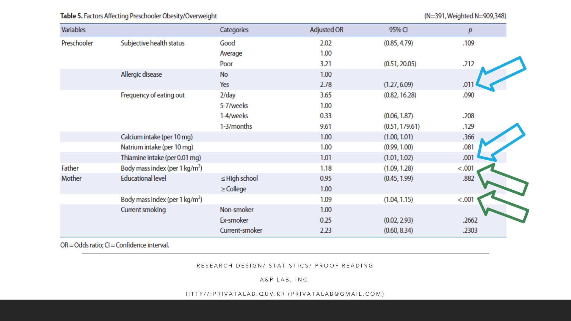 최종적인 결과를 보면, 하늘색 화살표로 표시된 아토피피부염, 알레르기비염, 천식 중 한 가지 질환이라도 진단받은 아동이 과체중 및 비만 발생 위험이 2.78배(95% CI: 1.27-6.09, p =.011) 높고, 초록색 화살표로 표시된 아버지의 체질량지수가 1씩 증가할수록 학령전기 아동의 비만 발생 위험은 1.18배(95% CI: 1.09-1.28, p <.001), 어머니의 체질량지수가 1씩 증가할수록 아동의 비만 발생 위험은 1.09배 (95% CI: 1.04-1.15, p <.001) 높아졌다.