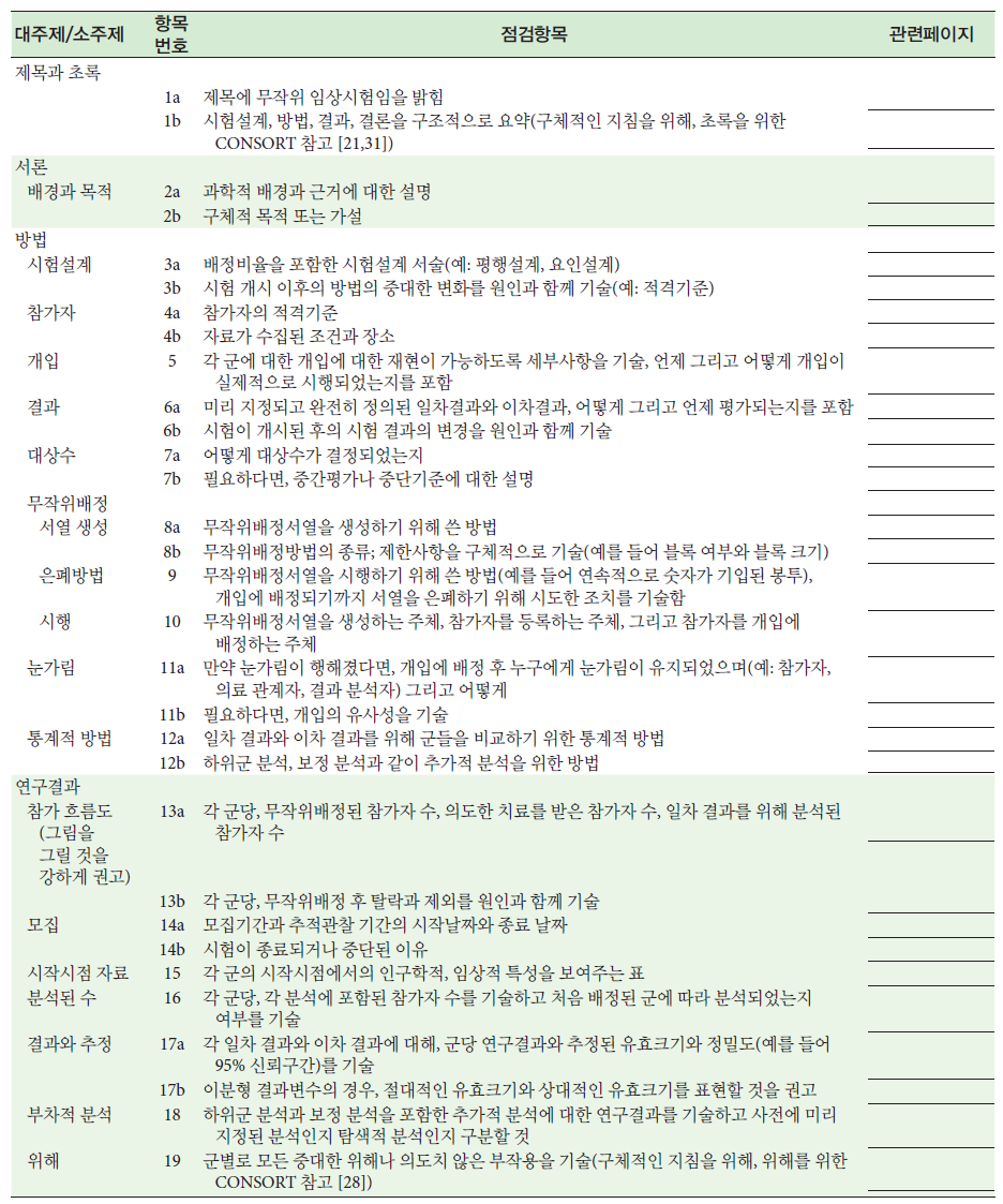 무작위 임상시험을 논문에 투명하게 기술하기 위해 반드시 포함되어야 할 연구 방법과 결과를 체크리스트와 순서도로 정리한 양식이다(Korean Journal of Family Medicine, 30(1), 1-14).