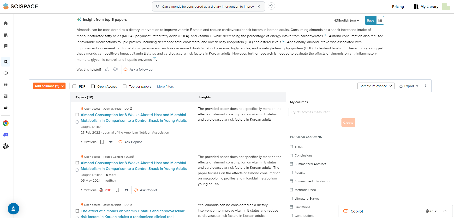 그러자, SCIspace가 10개의 참고논문을 정리하고, 그 중 Top 5 논문의 결과를 한 문단으로 요약해준다.