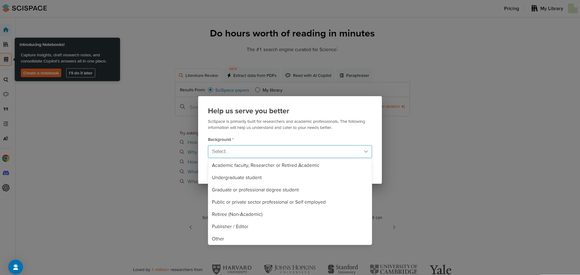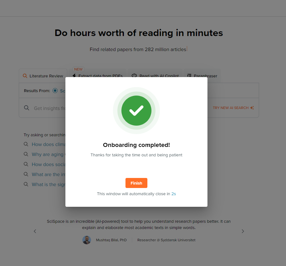 SciSpace는 간단한 정보만 클릭하면, 바로 서비스를 이용할 수 있다.