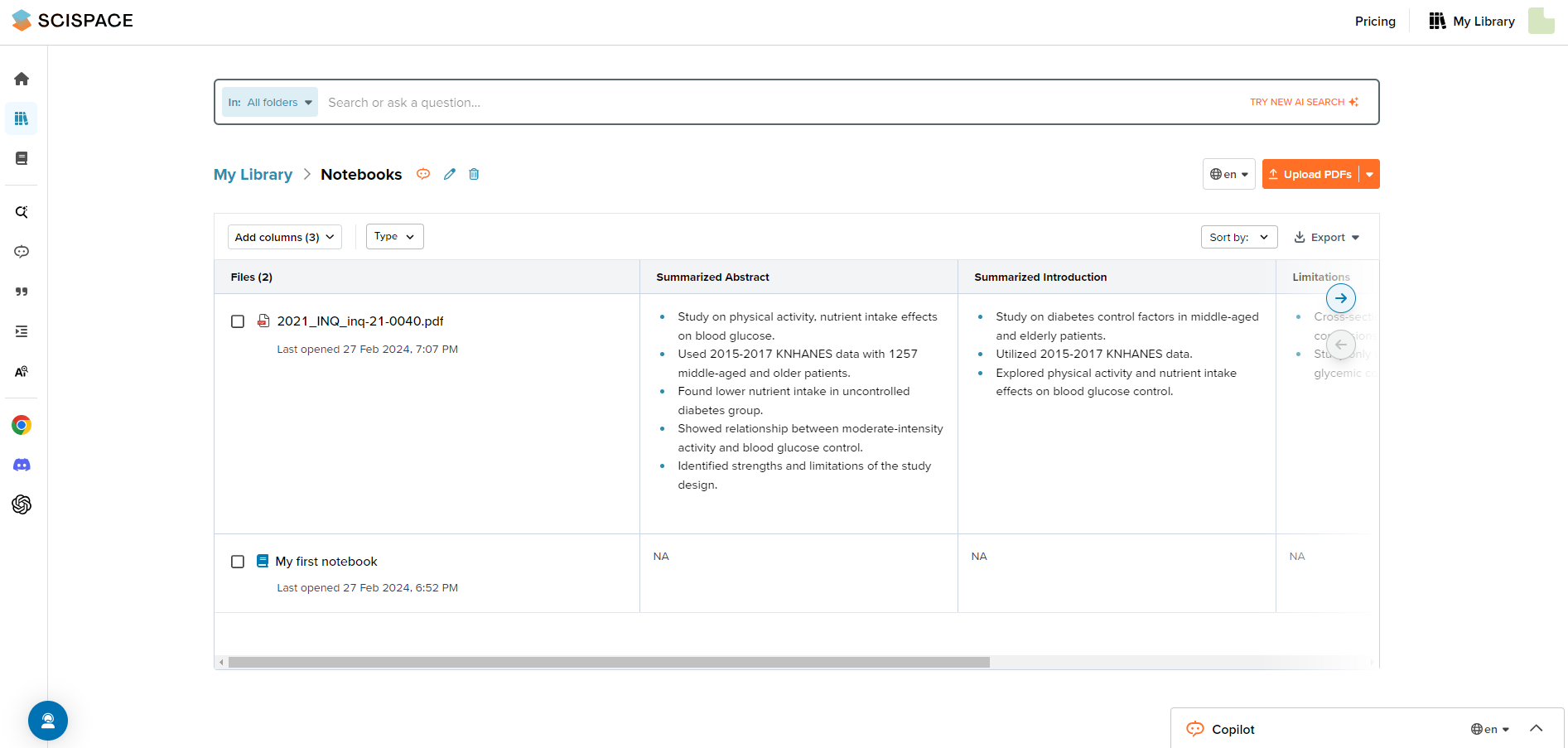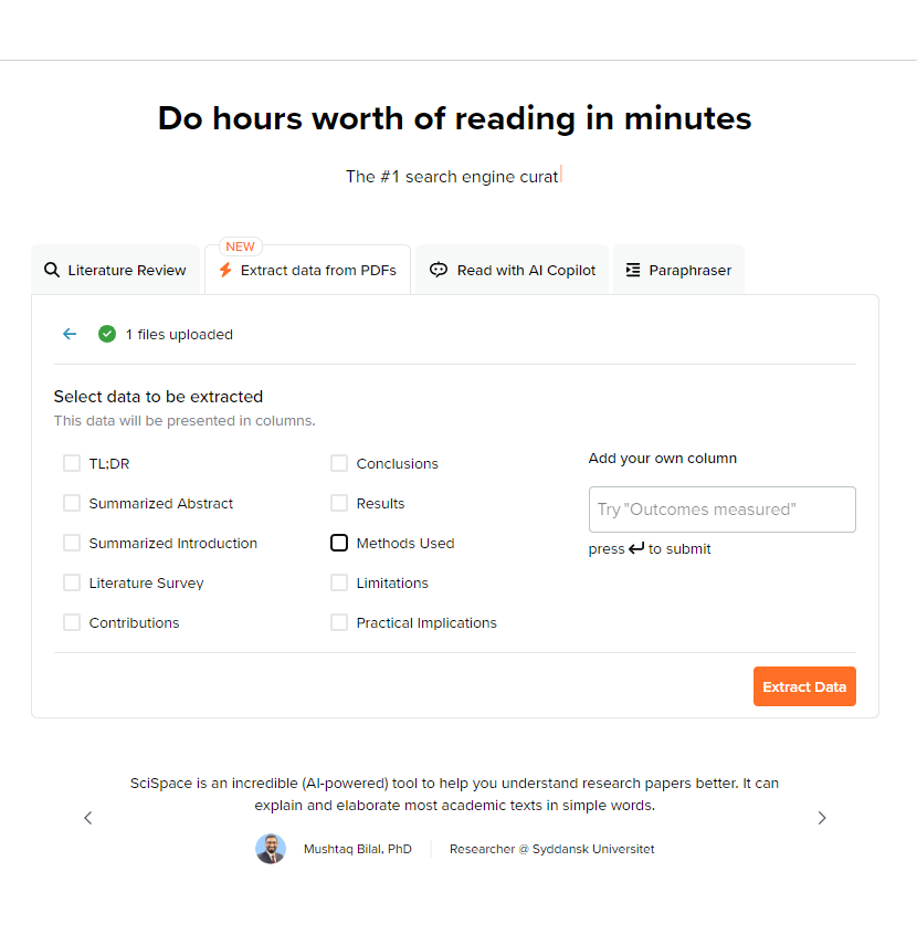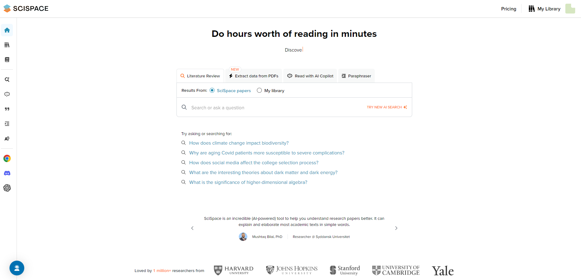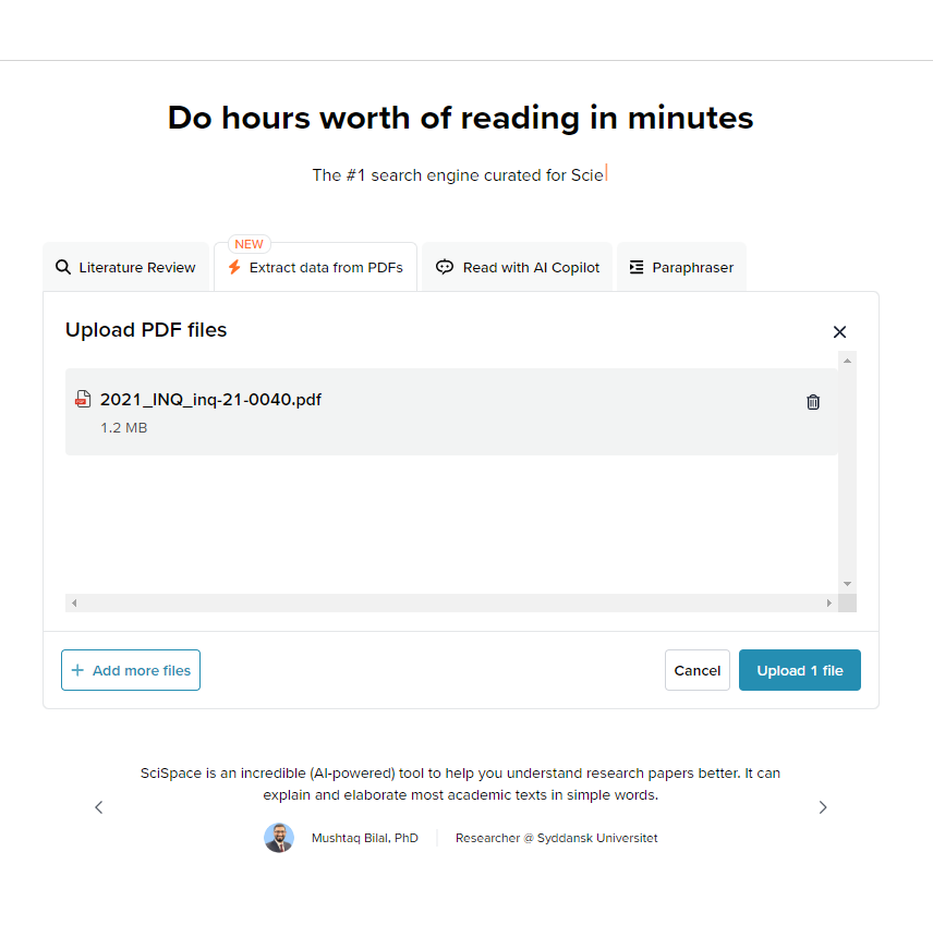 Chat with PDF and conduct your literature review faster using SciSpace. Discover 200M+ papers or upload your own PDF, highlight text or ask questions, and extract explanations and summaries.