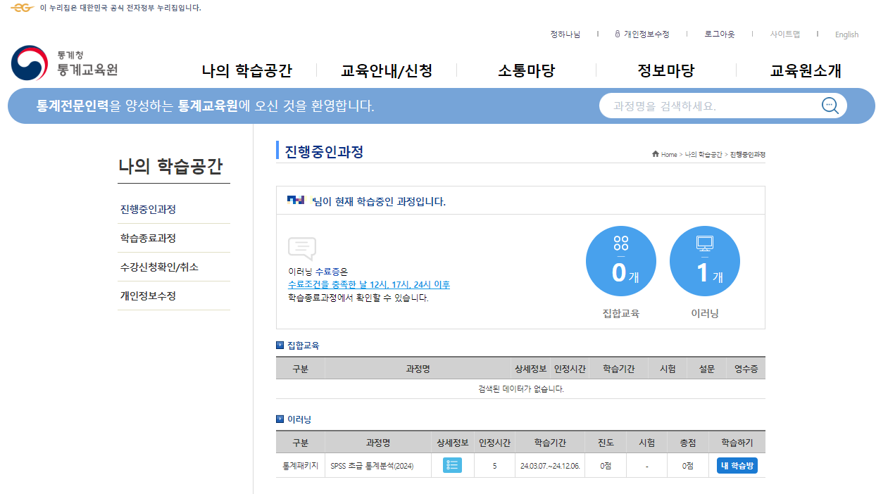 예를 들어, "SPSS 초금 통계분석(2024)"은 5시간을 이수하면 수료조건이 충족된다!