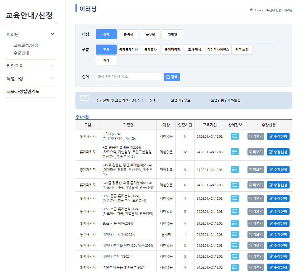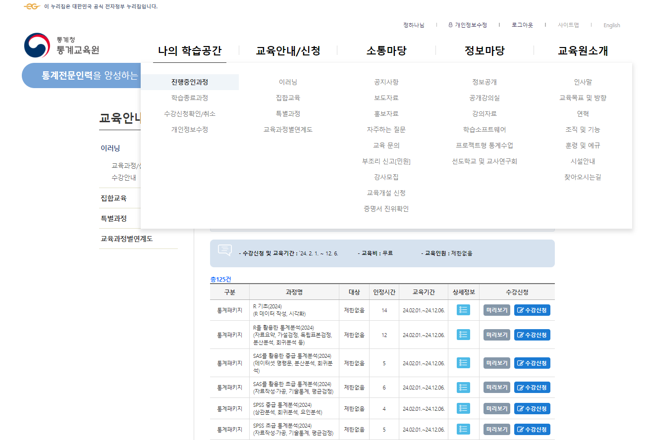 엑셀 통계와 데이터에 대한 이해부터, SAS, SPSS, R, 파이썬까지 연구나 업무에서 많이 활용되는 통계프로그램에 대한 기초적인 수업을 무료로 제공하고, 일정 시간 이상 들으며, 통계청 이러닝 수료증까지 받을 수 있다.