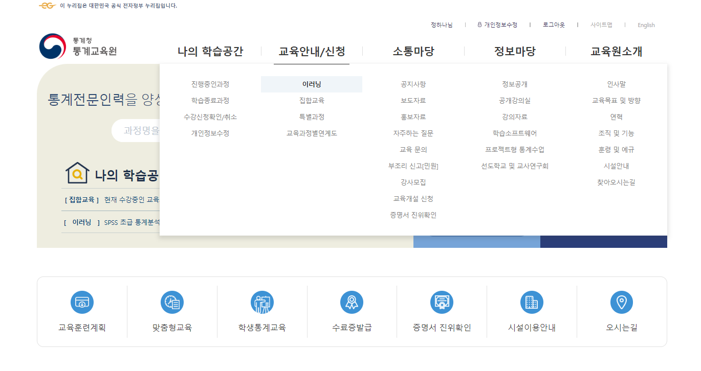 통계청 홈페이지에 접속해서 로그인을 하고 [교육안내/신청]에서 [이러닝]으로 들어가면,