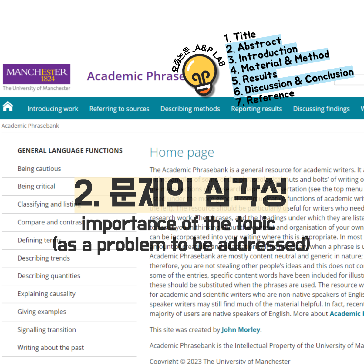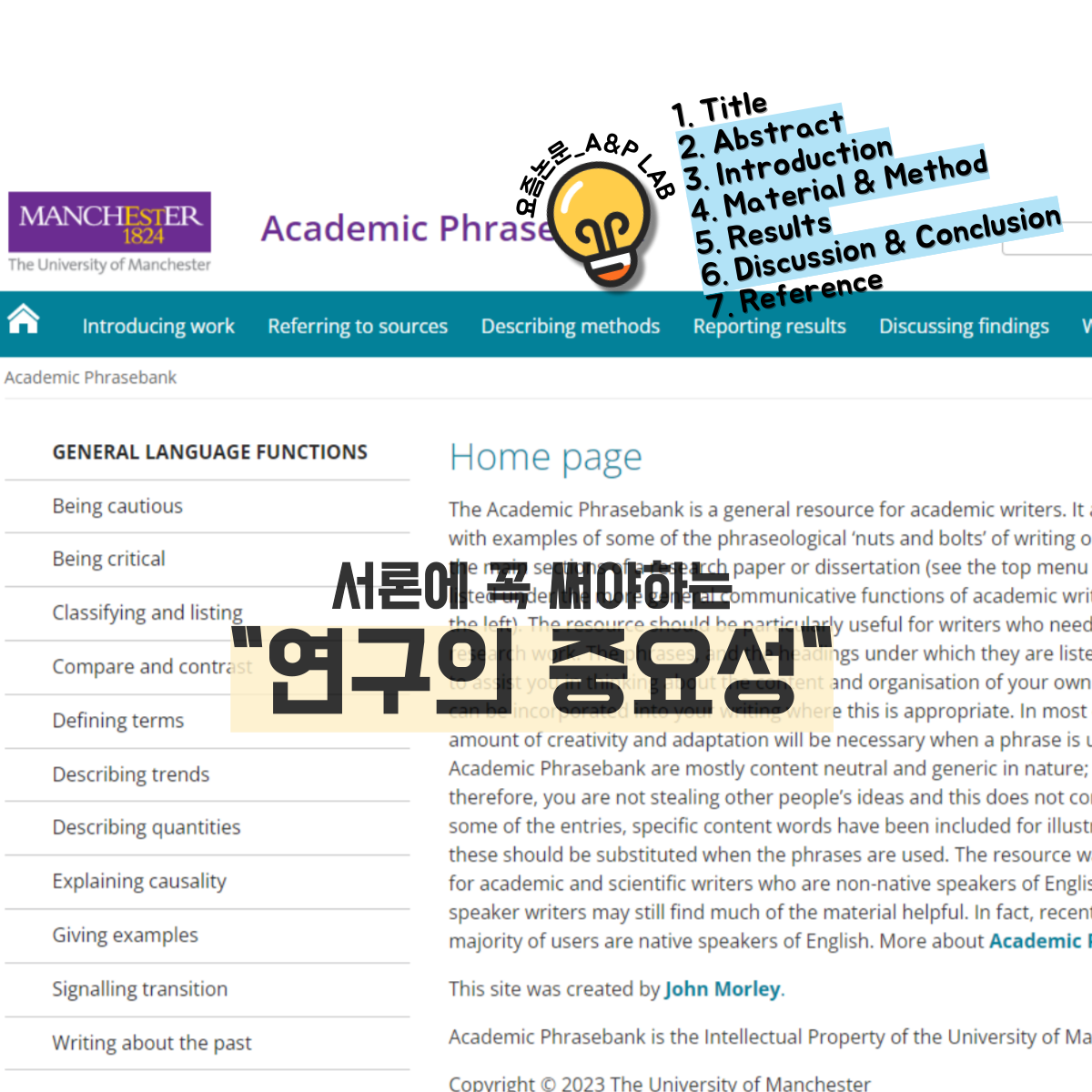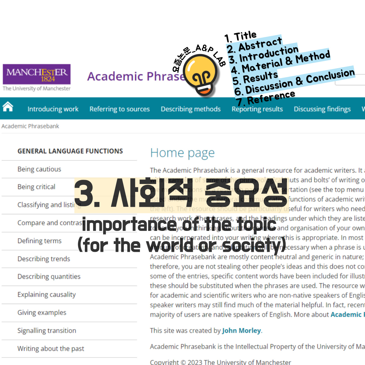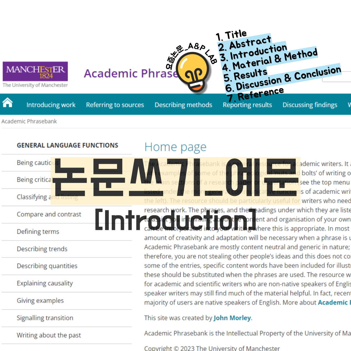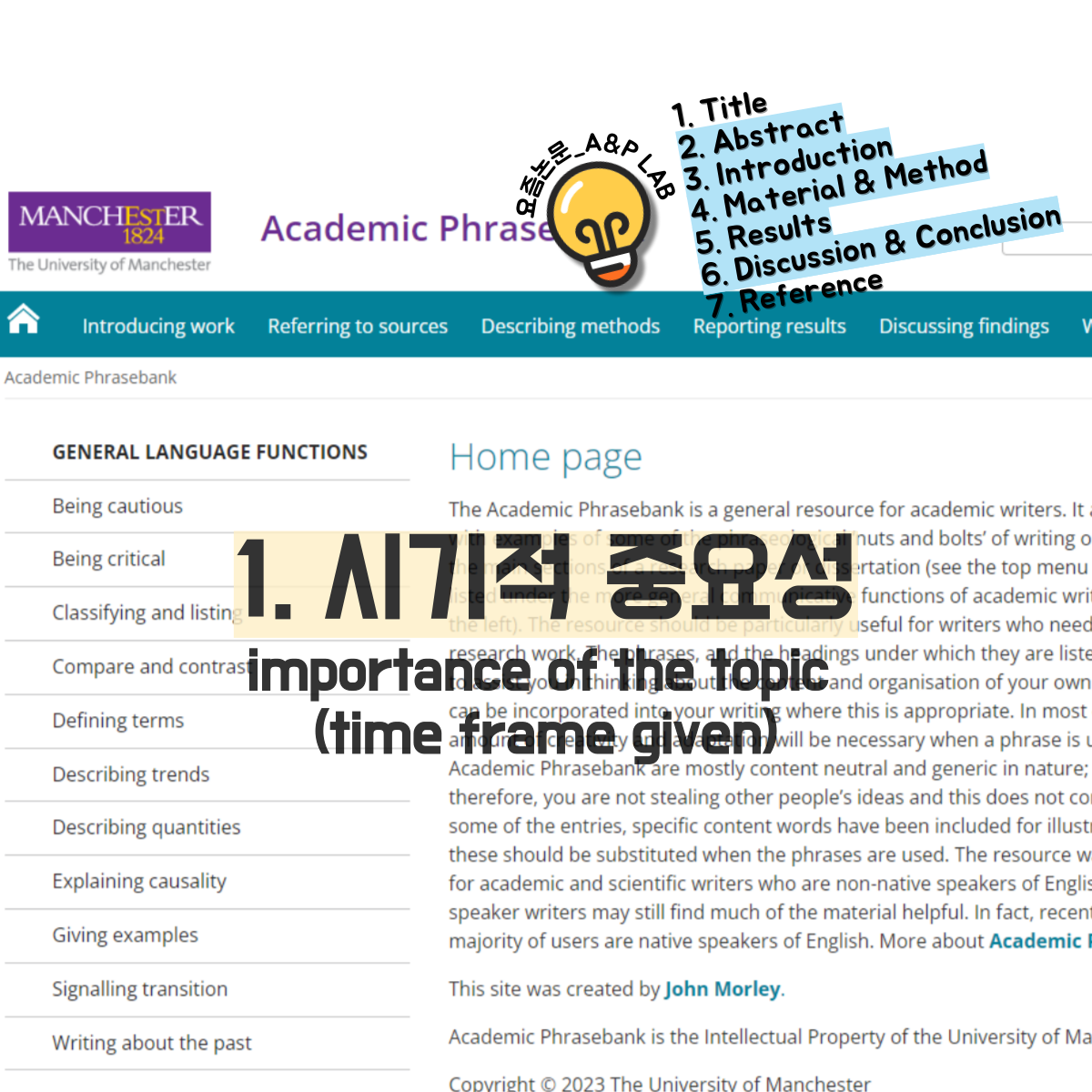 오늘 소개할 아카데믹 프레이즈뱅크는 영국 맨체스터 대학에서 만든 리소스로써, 학술적인 글쓰기에 대한 ...
