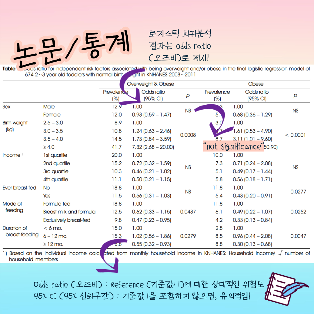 (로지스틱 회귀분석은 종속변수가 종속변수가 이분형이나 그 이상으로 나누어지는 범주형 변수일 때 사용하는 회귀분석으로, 독립변수에서 1인 범주가 기준(Reference)일 때의 종속변수에 대한 범주의 위험도를 상대적인 수치(Odds ratio)로 표현하는 것이다. 예를 들어, “지금 모유수유군은 그렇지 않은 군보다 비만일 #오즈비 가 0.43배 낮다.”라고 해석할 수 있다.