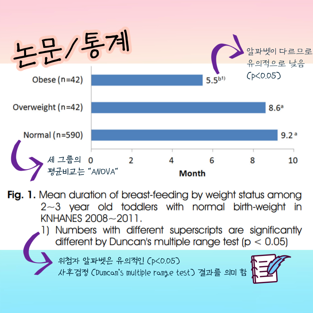 이 연구에서는 사후검정으로 Duncan을 사용했고, 그 결과를 막대그래프의 수치 옆에 위첨자(superscript)로 나타냈다. 여기서 서로 다른 알파벳은 통계적으로 유의적인 차이가 있다는 것으로써, 여기에서 위첨자로 a가 표시된 과체중과 정상체중군의 수유기간이 위첨자로 b가 표시된 비만군보다 길다고 해석한다.