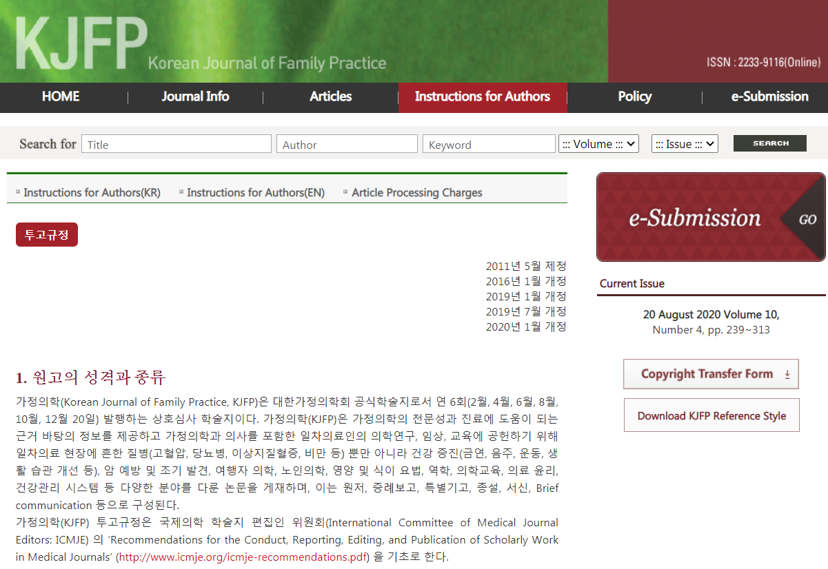 예를 들어, 가정의학회지를 살펴보면, 아래 화살표가 있는 instruction for author로 들어간다.