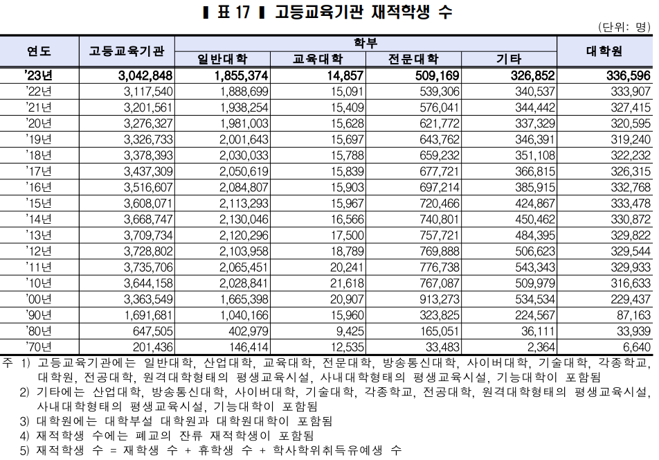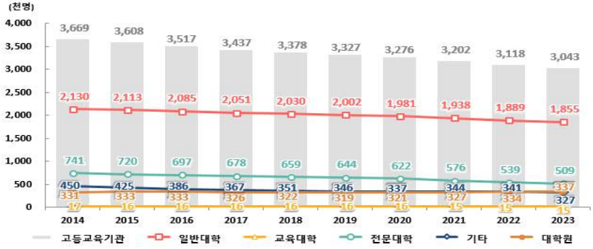 일반대학과 전문대학의 재적학생 수는 전년 대비 각각 33,325명(1.8%↓), 30,137명(5.6%↓) 감소했고, 대학원은 전년 대비 2,689명(0.8%↑) 증가했다. 특히, 대학원생은 2015년 333,478명을 정점으로 계속 감소하다가 2021년부터 계속 증가해서 2023년 가장 많은 336,596명이 재적 학생으로 보고되었다.
