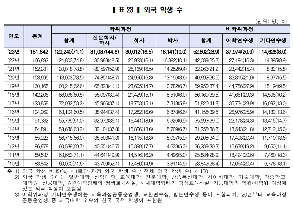 외국인 유학생(석·박사과정 재학생)이 10여년만에 2배 이상 급증하여, 2023년 현재 48,153명으로 전체 대학원생의 14.3%를 차지하고 있다.